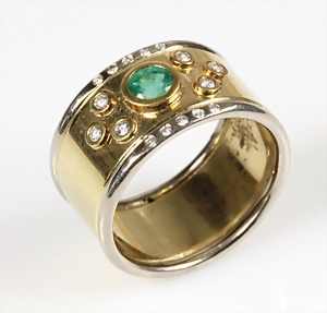Ring, GG/WG 585/000, 1 zentraler Smaragd (facettiert), 16 Brillanten ca. 0,16 ct tw/w-vsi, RW ca. 54, Ringschiehnenbreite ca. 11 mm, aus Geschäftsauflösung, Neupreis € 1375,-