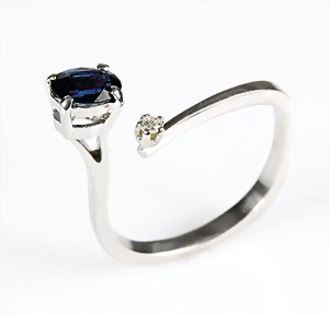 Saphir-Ring, WG 585/000, 1 Saphir ca. 0,65 ct (facettiert), 1 Diamant weiß, RW ca. 53, (eckige Ringschiene !)