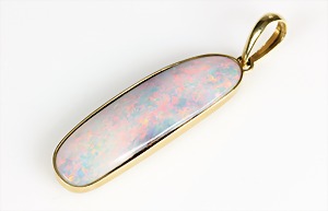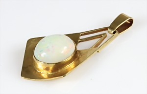 Anhänger, GG 585/000, Weißopal 11,5 x 9,5 mm, vorwiegend rote u. grüne Farbtöne, H = 38 mm