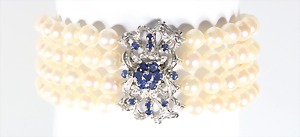 Armband, WG 750/000, 17 Saphire (facettiert), 4-Reihen Akoja-Perlen, D = 5,6-5,9 mm, 2 Stege halten das Band zusammen, integriertes Kastenschloß mit 2 Sicherheitsachtern, B = ca. 23,5 mm, L = 19 cm