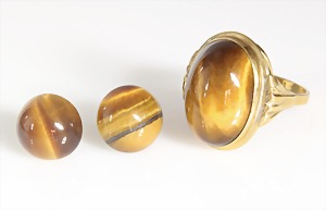 Lot: Tiegerauge, GG 333/000, 1 Ring, RW ca. 54; 1 Paar Ohrstecker D = 11,5 mm