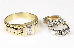 Lot: Ring, GG/WG 750/000, 1 Brillant ca. 0,18 ct w-si, RW ca. 63; 1 Paar Creolen, GG/WG 585/000, 6 Brillanten ca. 0,30 ctw-si, D = 15,5 mm