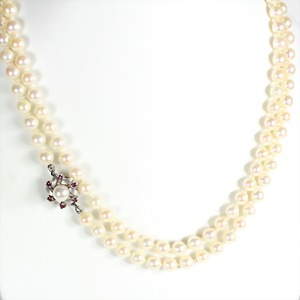 Akoja-Perlenkette, Schließe WG 585/000, 6 facettierte Rubine, Akoja-Perlen ca. 6,5 - 7 mm, L = 97 cm, schönes Lüster