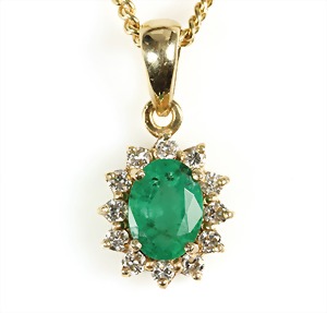 Anhänger "KLASSIKER", GG 585/000, 1 Smaragd ca. 0,75 ct oval geschliffen/facettiert, 12 Brillanten ca. 0,12 ct tw/w-vsi/si, H = 18,5 mm; Flachpanzer-Kette, GG 585/000, L = 38 cm, kurz !