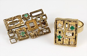 Lot: 1960/70er Jahre, GG 750/000, 1 Ring, 3 weiße u. 2 grüne facettierte Steine, RW ca. 53; Brosche, 1 weißer, 2 grüne facettierte Steine, ca. 27,5,5 x 18 mm, total 13,5 g