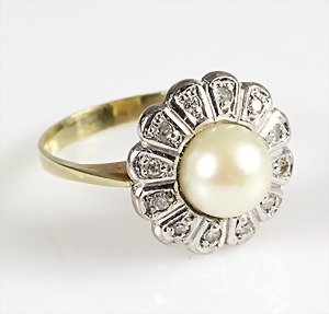 Ring, GG/WG 585/000, zentrale Akoja-Perle D = 7,8 mm mit umlaufendem Brillantkranz, 8 Brillanten ca. 0,25 ct, RW ca. 52