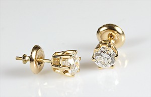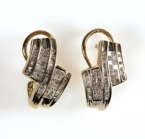 Diamant-Ohrclips, GG 585/000, 56 St. Diamanten im Princess-Schliff, 78 St. Diamanten im Trapez/Baguette-Schliff, total ca. 1,0-1,2 ct ct tw-vsi/p, H = 19,7 mm (Omega Brisuren mit Stift !)