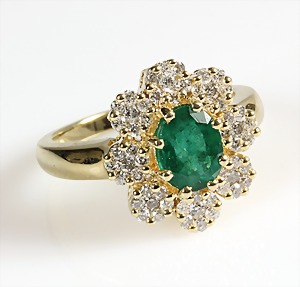 Ring, GG 585/000, zentraler Smaragd ca. 1,10 ct (6 x 8 mm dick !), 56 Brillanten ca. 0,55 ct tw/w-si/p, RW ca. 56