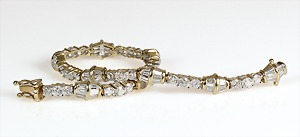 Diamant-Armband, GG 585/000, 27 St. Brillanten u. 54 Diamantbaguettes u.- trapeze, Total ca. 6,0 ct weiß/get. Weiß - piquet 1-2, untergebautes Kastenschloß mit 2 Sicherheitsachten, einzelne Elemente bewegl. gearbeitet, L = 17,8 cm