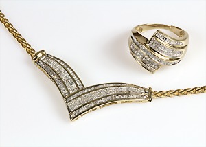 Lot: 1 Ring, GG 585/000, 40 St. Diamanten im Princess-Schliff, 49 St. Diamanten im Trapez/Baguette-Schliff, total ca. 1,0 ct tw-vsi/p, RW ca. 55; Collier, GG 585/000, Mittelteil mit Diamanten ausgefasst, 70 St. Diamanten im Princess-Schliff, 105 St. Diamanten im Trapez/Baguette-Schliff, total ca. 1,9 ct tw-vsi/p, L = 45 cm