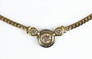 Brillant-Collier, GG/WG 585, 3 Brillanten ca. total 1,0-1,1 ct w/getönt-p2 (mittlerer Stein ca. 0,75 ct), L = 43,5 cm
