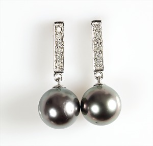 Ohrhänger, WG 585/000, 12 Diamanten ca. 0,10 ct weiß, 2 Tahitiperlen D = 9,0 mmm, H = 23 mm