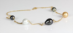 Collier, GG 585/000, 6 St. tropfenförmige Tahiti/Südseeperlen, multicolor, L = 45,5 cm