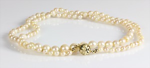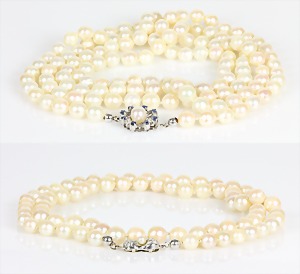 Akoja-Perlenkette im Verlauf 5,7-6,9 mm, Schließe, GG/WG 585/000, L = 59,5 cm und Akoja-Perlenkette, Schließe WG 750/000, 8 Saphire fac., Perlen D = 7 - 7,5 mm, L = 113 cm