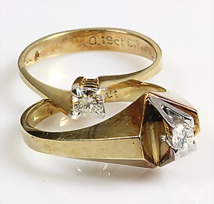 Lot: GG 585/000, 1 Ring mit Brillant ca. 0,15 ct tw/w-vsi, 1 Ring mit Brillant ca. 0,21 ct tw/w-si, beide Steine weiß gefasst, RW ca. 55