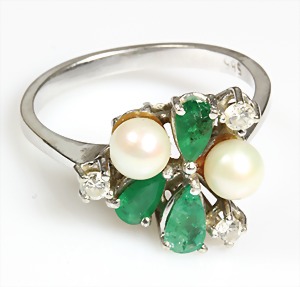 Ring, WG 585/000, 3 Brillanten ca. 0,16 ct w-si, 3 Smaragdtropfen (facettiert), 2 Akoja-Perlen D = 4,3 mm, RW ca. 52,5