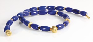 Lapiskette, Schließe u. Zwischenteile GG 750/000, Lapis (Olivenform) in feiner, farbintensiver Qualität, D = 8 mm,L = 46,5 cm, total 50,3 g