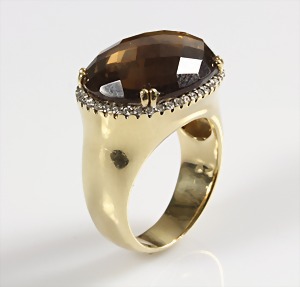 Ring, GG 585/000, Rauchquarz (facettiert), oben mit Schachbrettmuster ca. 20 x 16 mm, Brillantkranz 42 St. ca. 0,30 ct w/p1, RW ca. 58