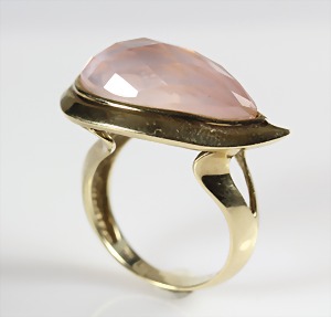 Ring, GG 375/000, Rosenquarz (facettiert), oben mit Schachbrettmuster ca. 21,5 x 12 mm, RW ca. 56,5, ausgefallenes Design