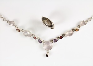 Lot: 1 Ring, Silber 925/000, Rauchquarz in Navetteform ca. 29x 13,5 mm, RW ca. 59; 1 Collier, Silber 925/000, Rosen-u. Rauchquarz, Amethyst u. Granate, Knebelverschluß, L = 43 cm