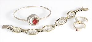 Lot Silberschmuck: 2 Ringe, Silber 925/000 mit Citrin u. Granat, RW ca. 60; 1 Armband, Silber 835/000 mit 5 Bergkristallen (facettiert) D = 11 mm; 1 Armreif mit Carneol, Silber 835/000, Innen: 65,5 x 51 mm