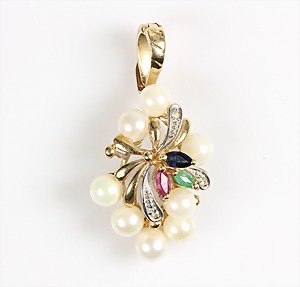 Perlanhänger, GG 585/000, 8 St. Akoja-Perlen, 3 Diamanten weiß, je 1 Rubin, Saphir u. Smaragd in Navetteform, H = 33,5 mm (Schlaufe zum Öffnen !)
