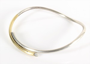 Moderner Halsreif, Silber 925/000, GG 750/000 (ca. 1/4 Kreissegment), 1 Brillant ca. 0,02 ct tw-vsi, der Halsreif läßt sich links u. rechts über 2 Scharniere öffnen, Innen: D = 13,5 cm, Scharnier D = 6 mm, 160,4 g