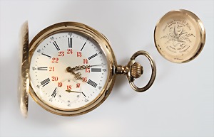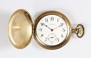 Herren-Taschenuhr Anfang 20.Jhd., Handaufzug, GG 585/000, weißes E.Z.Blatt, rote arab. u. schwarze röm. Zahlen, feine, verzierte Zeiger, kl. Sekunde auf 6 Uhr, Breguetspirale, beidseitig graviertes Gehäuse, D = 52,5 mm, Uhr läuft (kl.Druckstellen im Gehäuse) !