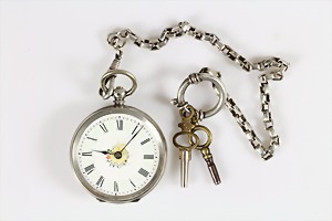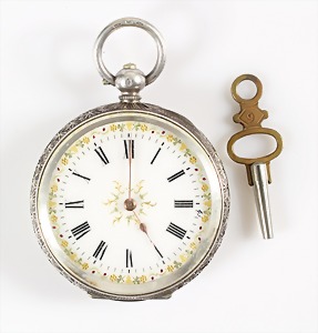 Herren-Schlüsseltaschenuhr Ende 19.Jhd., Silber 800/000, gut erhaltenes E.Z.Blatt mit zarter floraler Bemalung, gebläute, feine Zeiger, röm. Zahlen, D = 39,5 mm, Zwischenboden Metall, Rückseite graviert, Uhrenkette, Silber 835/000, L = 25 cm, 2 Uhrenschlüssel, Uhr läuft