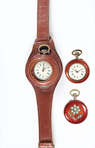 Damentaschen-Uhr, (umfunktioniert zur Armbanduhr) um 1900, Silber 800/000 verg., sehr feine Zeiger, röm Index, Std. Punkte in Gold, beidseitig transluzides Emaille, guillochiert, Rückseite mit Blumendekor (mit 1/2 Perlen ausgefasst), sehr gut erhaltenes orig. Lederband mit Dornschließe, Uhr läuft an, muß gereinigt werden ! dezente Abplatzer im Emaille, 1 Stck. 1/2 Perle fehlt !