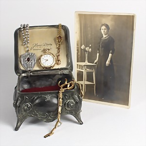 Lot Zeitgeschichte um 1900: 1 Damen-Taschenuhr, GG 585/000, D = 27,5 mm, mit passendem Armband (Doubleé) um die Taschenuhr als Armbanduhr zu Tragen, 1 Uhrenkette mit Schieber (Doubleé), 1 JUGENDSTIL Schmuckschatulle (von Hans Rexin, Juwelier in Mannheim, Planken Q2), 1 zeitgemäßes Bild mit Dame, diese trägt das abgebildete Armband (in Silber) mit einem Jugendstilanhänger, ….. Uhr läuft !