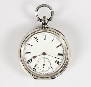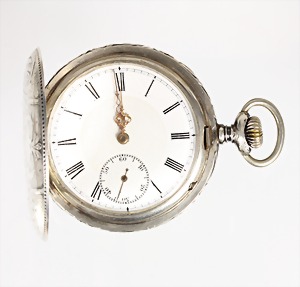 Herren-Ankertaschenuhr um 1890/1900, Silber (geprüft), nicht gepunzt, sehr gut erhaltenes E.Z.Blatt, grazile Zeiger, röm. Zahlen, kl.Sekunde auf 6 Uhr, Sprungdeckel, Gehäus beidseitig aufwändig graviert, D = 51,2 mm, Uhr läuft !