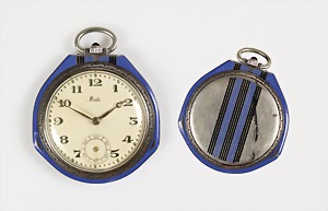 Herren-Taschenuhr "ART-DECO" der 1920er Jahre, Silber 935/000, sig: MIDO, SWISS MADE Nr: 253037, feineZeiger, kl. Sek. Auf 6 Uhr, arab. Goldfarbene Zahlen, goldene Minutenpunkte, Krone mit blauem Steincab., schwarzes u. blaues Emaille in feinen Streifen u. umlaufend am Gehäuse, Uhr läuft ! sehr schönes ART-DECO !!!