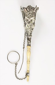 Sträußchenhalter für die "Hochzeitsbraut" um 1930, Silber (geprüft), fein ornamentiert u. durchbrochen gearbeitet, gedrechseltes Bein, Ring mit Kette zum Halter am Fingen u. Stift um das Sträußchen zu fixieren, L = 11,8 cm, oben ca. 26,5 x 26,5 mm, hat nicht jeder !