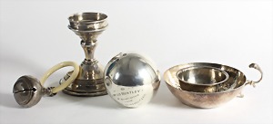 Lot: Silberwaren England 1. Hälfte 20.Jhd., 925/000 Sterlingsilber, 1 Kerzenleuchter H = 8,8 cm, D = 8,0 cm (Fuß gefüllt); 1 kl. "KANU", L = 84,5 mm, 1 kl. Krug, sig: M B, (Deckel zum Abnemen), alles Birmingham; 1 "TRILLERPFEIFE" Ende 19.Jhd., L = 63 mm, 1 kl. Schale mit Monogramm: NP, D = 61 mm, alles Chester; dazu 1 Kinderrassel versilbert, 1 Pokal "ARROL BOWLING CLUB" to Mr J.H. HUNTLEY 8.10.66, D = 63,5 mm (gefüllt), als Zugabe: Schale mit kl. Henkelgriff, Silber 925/000, Korpus mit Hammerschlag, D = 9,5 cm, alles total ca. 600 g