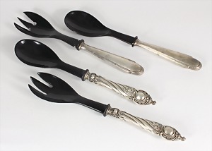 Lot: Salatbesteck, 1 x Silber 800/000, reich verzierter Griff, Laffeln: Horn, L = 23,7 cm; 1 x WMF "KREUZBAND", I/O, Laffeln: Horn, L = 23,5 - 24 cm