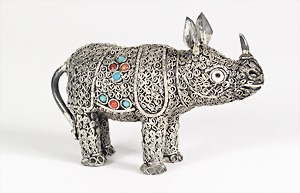 Tischobjekt/Briefbeschwerer, "NASHORN" 1960er Jahre, Silber 925/000, Türkis u. Korallencab., aus vielen kleinen Drahtschnecken zusammengesetzter Körper, L = 78,5 mm, H = 56 mm, total 61 g