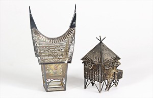 Zwei Häuschen, Asien Mitte 20.Jhd., Silber, in filigraner Drahttechnik gearbeitet, H = 60 mm u. 100 mm, total 59,8 g
