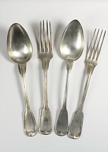 Lot: 51 teilig. Besteck "AUGSBURGER FADEN", 1 Set: "BRUCKMANN", versilbert 40, je 11 Gabeln u. Löffel, L = 21 u. 21,5 cm, (mit Monogramm MZ); 1 Set: vorwiegend Fa. "CHRISTOFFLE" versilber, 12 Gabeln u 13 Löffel, L = 20,5 u 21 cm, 4 Dessertgabeln, L = 18 cm