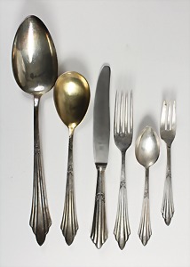 Eßbesteck 56 Teile: WMF FÄCHER, Silber 90 Auflage, 9 Kuchengabeln, L = 15 cm; 10 Kaffeélöffel, L = 14 cm, 6 Dessertgabeln; L = 18,2 cm; 6 Dessertmesser; L = 21 cm; 6 Gabeln, L = 20,5 cm; 6 Messer, L = 25,5 cm; 6 Löffel, L = 21 cm; 1 kl. Vorlegelöffel (Laffel beidseitig vergoldet), L = 19,7 cm; 2 gr. Vorlegelöffel, L = 21 u. 26 cm; 3 kl.Gabel, L = 14 cm; 1 Tortenheber, L = 26,3 cm