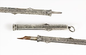 Reise-Stift, England, Birmingham 1900-1901, Silber 925/000, sig: W.V&S, "Bleistift u. Tintenfüller" in Einem !, Durch einen Schiebemechanismus läßt sich der jeweilige Stift raus-u. reinschieben ! 6-eckiges, graviertes Gehäuse, L = 75 mm (eingeschobenen), bis L = 99 mm (im Schreibzustand)