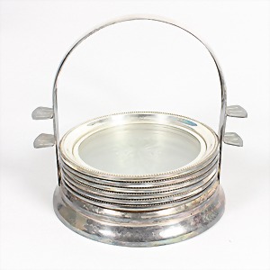 Versilberte Etagere mit Henkel um 1930, 6 Teller mit Glasboden u. eingeschliffenem Sternmuster, seitliche Halterung für 6 kl. Messer, D = ca. 19 cm