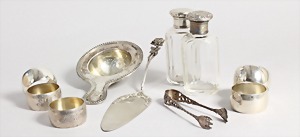Lot: Silber 800/000 bis 925/000, 5 Serviettenringe D = 40 mm; 1 Teesieb L = 12,7 cm ; 1 kl. Tortenheber L = 20 cm; 1 kl. Zuckerzange L = 9 cm; 2 kl. Flacons mit Schraubdeckel, ENGLAND", H = 9,5 cm