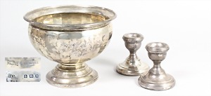 Lot: 1 Schale "BIRMINGHAM" von 1926, Sterlingsilber, sig.: D & B, H = 10,5 cm, D = 14,5 cm; 2 kl. Kerzenständer "BIRMINGHAM" Sterlingsilber, sig.: S.J.R., H = 6,0 cm, Fuß mit Kitt gefüllt, total 380 g