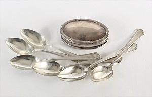 Lot: 6 Kaffeélöffel, Silber 800/000, sig.: SCHMIDT, L = 13 cm (Monog: E); 1 Dose, Anfang 20.Jhd., AMERIKA, Silber 925/000, Deckel mit Randverziehrung, über Scharnier zu Öffnen, oval ca. 76 x 51,5 mm