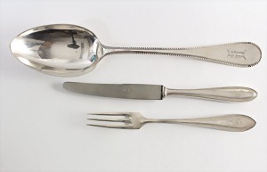 Lot: 6 Eßlöffel mit Perlrand, Silber 800/000, L = 21.3 cm, total 305 g; Obstbesteck, CBS, versilb. 90; je 3 Messer u. Gabeln mit zartem Perlrand, L = 16,8 u. 14,5 cm, beide mit Monog.: H E