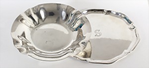 Lot: 1 Tablett Mitte 1930er Jahre "KLASSIKER", Silber 930/000, sig: Wilkins 930 S, Nr 7385 D = 24, Gravur oben: S, rückseitig: M.W. 20.2.1936; 1 Schale, Silber 800/000, sig: Ährensymbol, D = 21,8 cm, beide total 468 g