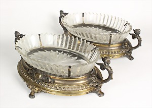 1 Paar Schalen mit Glaseinsatz um 1880, Silber 800/000, sig.: 800 M, Reste alter Feuervergoldung, seitlich angesetzte Griffe an deren Ende sich geflügelte Puttenköpfe befinden, das geschliffene, oben gezackte Glas wird an 4 Stellen mit Silberstegen gehalten, 4 Füße geben der Schale etwas Leichtigkeit, einige Glasspitzen leicht bestoßen, Maße: 27,5 x 17,3 x 8,3 cm