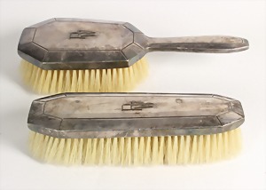 Lot: Kleiderbürsten "ART-DECO", Frankreich/Belgien ? um 1930/40, 1 Bürste (ohne Griff), sig: SF mit 4 Sternchen 6, ca. 18,5 x 5,5 cm, leicht im Verlauf; 1 Bürste mit Griff, sig: SF mit 4 Sternchen 8, L = 23,5 cm, beide Bürsten mit in Holz eingelassene Naturborsten, auf dem Rücken monogrammiert: RW