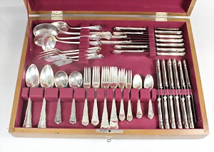 104 teiliges Essbesteck für 12 Personen, WILKINS "CHIPPENDALE", Silber 800/000, je 12 Gabeln, Messer u. Suppenlöffel, L = 19 - 22,0 cm; je 12 Dessertgabeln u. Messer, L = 17,3 - 21,3 cm; 12 feine Suppenlöffel, L = 15,5 cm; 12 Kaffeélöffel, L = 13 cm; 12 Kuchengabeln, L = 14,7 cm; des weiteren: 1 Tortenheber, L = 22,8 cm; 2 Fleischgabeln, L = 20 cm; 1 Buttermesser, L =17,3 cm. 1 Käsemesser, L = 18 cm; 1 Soßenkelle, L = 18,8 cm; 1 mittlerer Vorlegelöffel, L = 21,7 cm u. ein gr. Vorlegelöffel, L = 26 cm, das Besteck befindet sich in einem sehr guten Zustand u. kann in dem Eichenkasten verwahrt werden, Kasten, Maße ca. 53 x 39 x 9 cm, total 3,1 kg (ohne Messer)